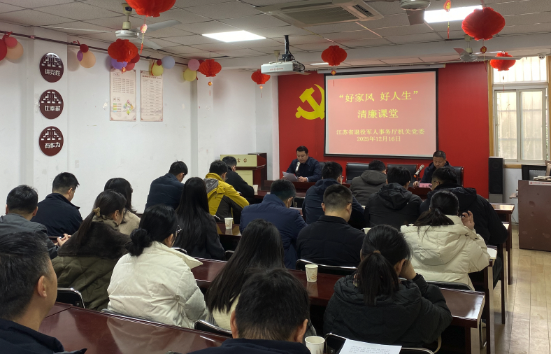 为深入学习贯彻习近平总书记关于注重家庭家教家风建设的重要论述,巩固拓展深入贯彻中央八项规定精神学习教育成果,持续推进廉洁机关建设,12 月 16 日下午,省退役军人事务厅在南京市建邺区水西门社区家风家训教育基地举办“好家风 好人生” 清廉课堂活动。厅机关、驻宁直属单位新入职、新任职党员干部,40 周岁以下青年党员干部代表 30 余人参加。