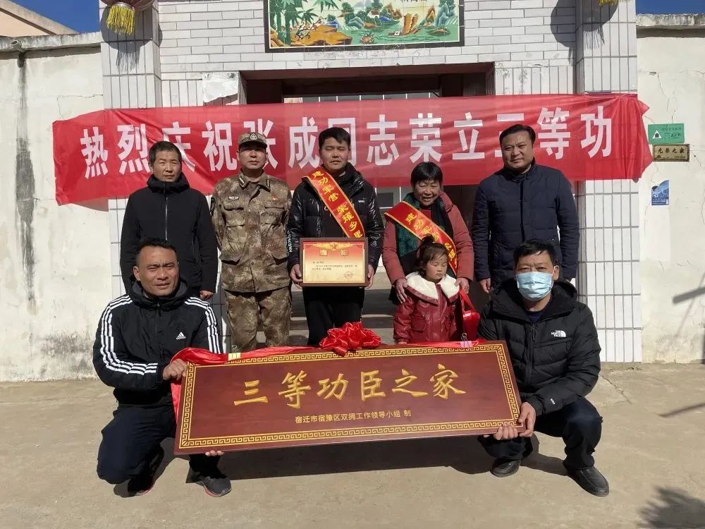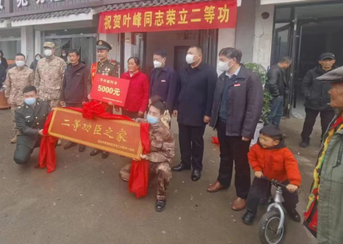 宿迁市湖滨新区、宿豫区人民武装部等一行人前往皂河镇现役军人叶峰家中,为其送上荣立二等功的喜报、慰问金和“二等功臣之家”牌匾。作为一名战士,叶峰苦练军事技能、砥砺血性胆气,争当强军先锋,入伍10年来一直严格要求自己,先后两次荣立个人三等功,获得“四有”军人等荣誉;2016年度因战备训练成绩突出,他被中央国防动员部表彰为“军事训练”先进个人。在叶峰家里,军地一行详细了解了其家人的身体和生活情况,感谢他们为国家、为部队培养出优秀人才,并祝福他们身体健康、新春快乐。