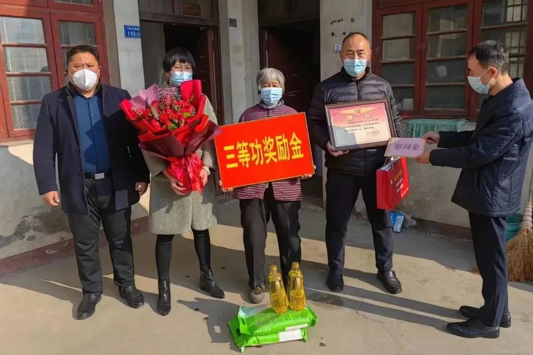 宿豫区为4名立功受奖军人家庭送去立功喜报,向他们传达党和政府的关怀和美好祝愿。活动现场敲锣打鼓、喜气洋洋。由区人武部、区退役军人事务局、属地乡镇有关同志组成的“报喜”分队先后来到仰化镇、来龙镇、曹集乡等地,将喜报和奖励金送到军属手上,并为立功军人家庭送去“功臣关爱大礼包”:立功军人父母免费体检单、有线电视三年免费收视协议、拥军优属银行卡等福利。